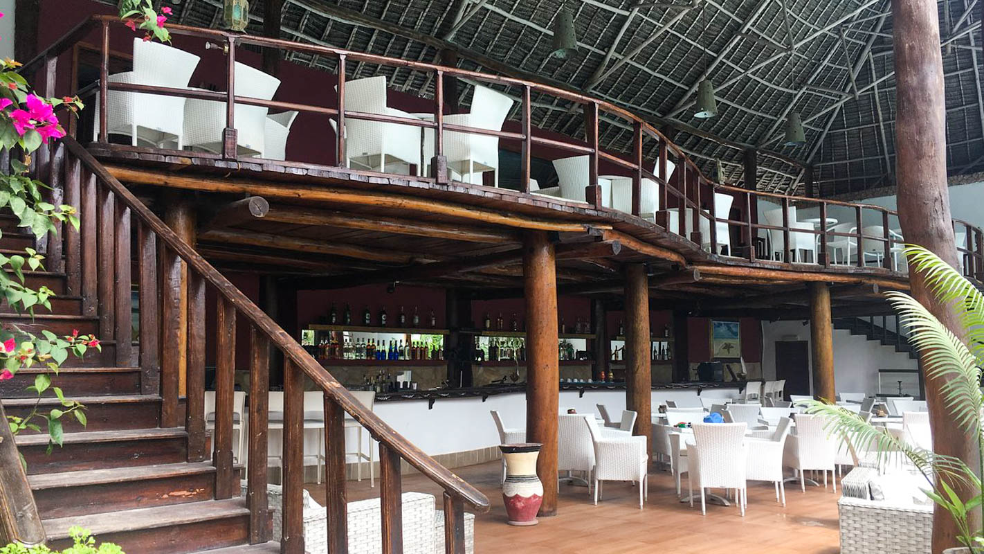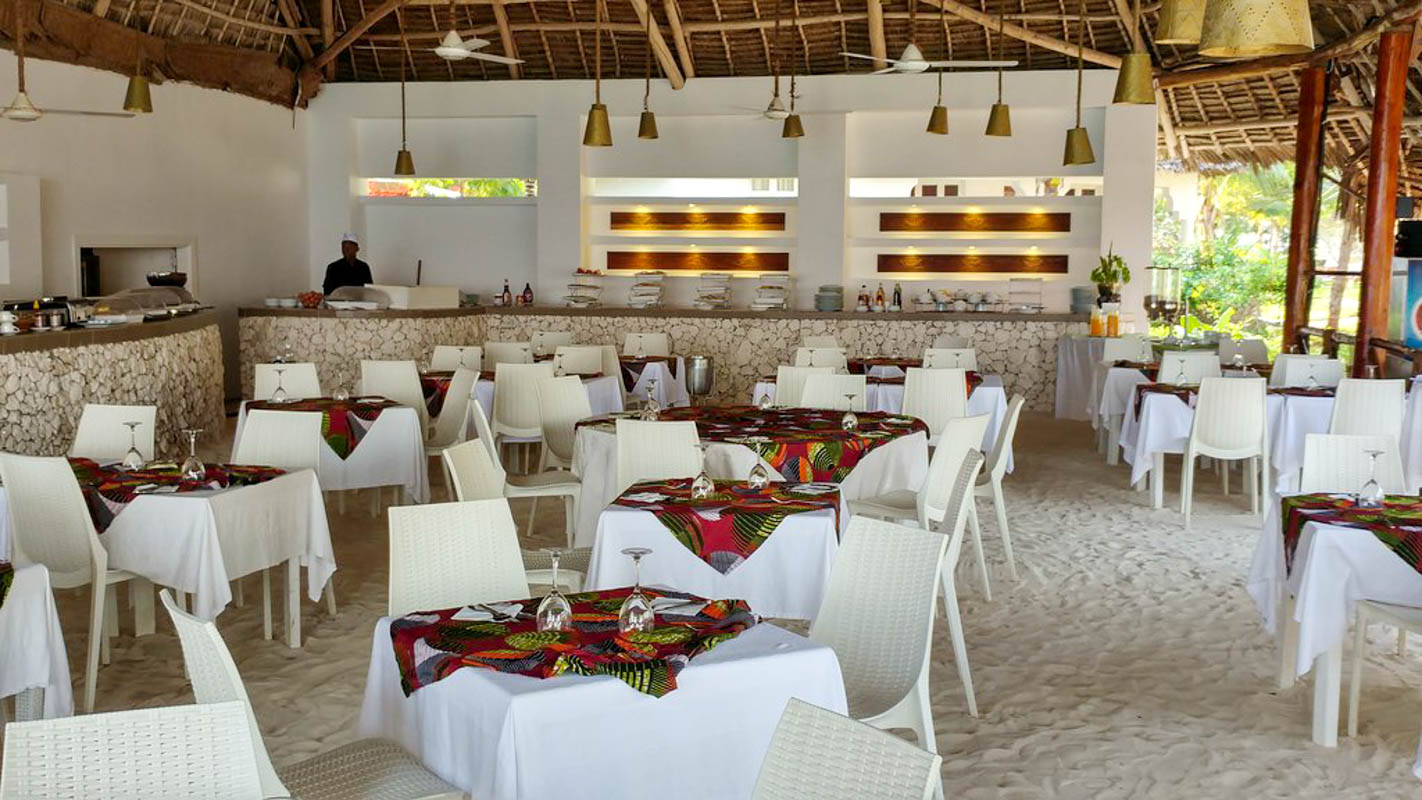 Ristorazione e Bars A disposizione dei clienti 2 ristoranti: il ristorante principale che offre un servizio a buffet con una vasta gamma di piatti tra cui scegliere, cucina italiana e internazionale; il ristorante "Mwezi Beach", situato sulla spiaggia con gli stessi servizi del ristorante principale, è riservato ai clienti che soggiornano nelle “Ocean View” e nelle “Ville” ed è anche aperto al pubblico con il menu à la carte (prenotazione richiesta). Il "Sawa Sawa Bar", situato ai margini della piscina, offre la colazione tardiva dalle 10:00 alle 12:00 e il Tea Time verso le 17:00. Presso questo bar ed anche presso il "Bio Bar", situato accanto al ristorante Mwezi, è possibile gustare, a pagamento, cocktail esotici con i frutti di Zanzibar, Drink con prodotti internazionali e caffè espresso italiano.