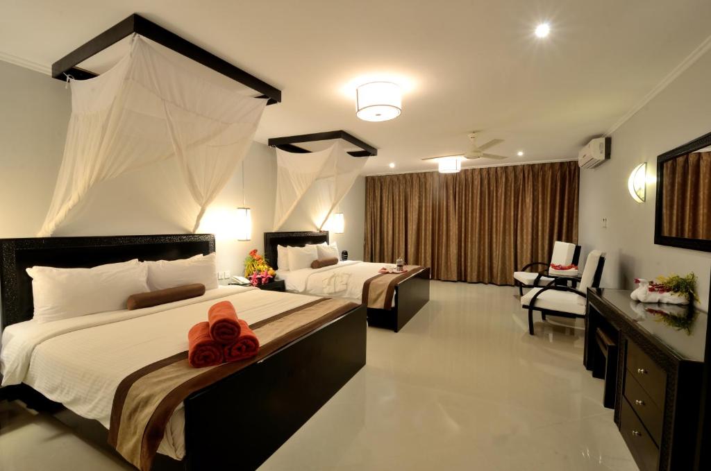 92 camere, in buona parte recentemente rinnovate, tutte dotate di aria condizionata, ventilatore a soffitto, telefono, cassetta di sicurezza, bollitore per tè e caffè, ferro da stiro, minifrigo (2 bottiglie di acqua incluse al giorno), Wi-Fi, asciugacapelli, adattatori elettrici, balcone o veranda attrezzata con sedie e tavolino.